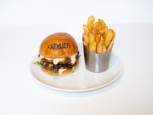 Minced Beef Patty, Roquette Leaves, Mushroom, Caramelized Onion, Cheddar Cheese, Home-made Bun & French Fries