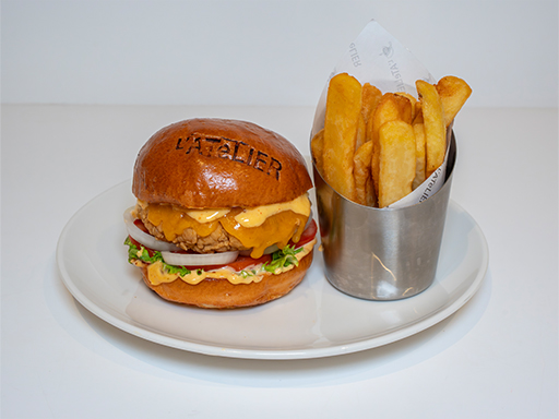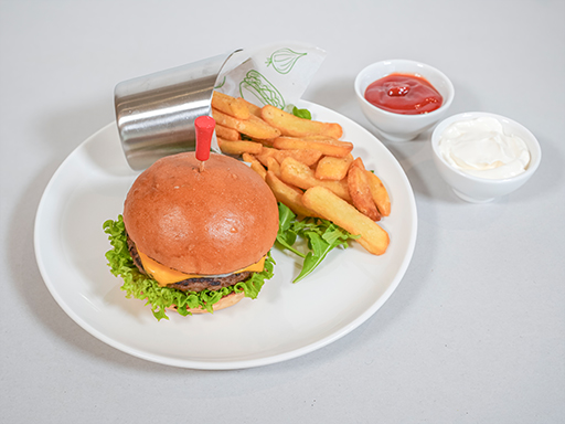 Beef Patty, Tomatoes, Lettuce, Cheddar Cheese, Home-Made Bun & French Fries