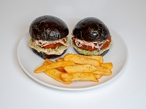 Black Bun, Avocado, Carrot, Cabbage, Garlic, Dynamite Sauce & Fries