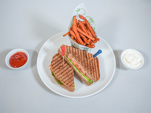 Chicken Patty, Tomatoes, Lettuce, Onions, Cheddar Cheese, Dynamite Sauce & French Fries