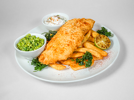 Nile Perch, Tempura Batter, Cream, Mushy Peas & Garlic, Served with Tartar Sauce