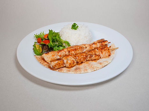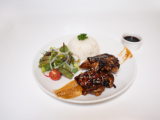 Grilled Chicken Skewers, Tonkatsu Sauce, Levantine Salad & Steamed Rice